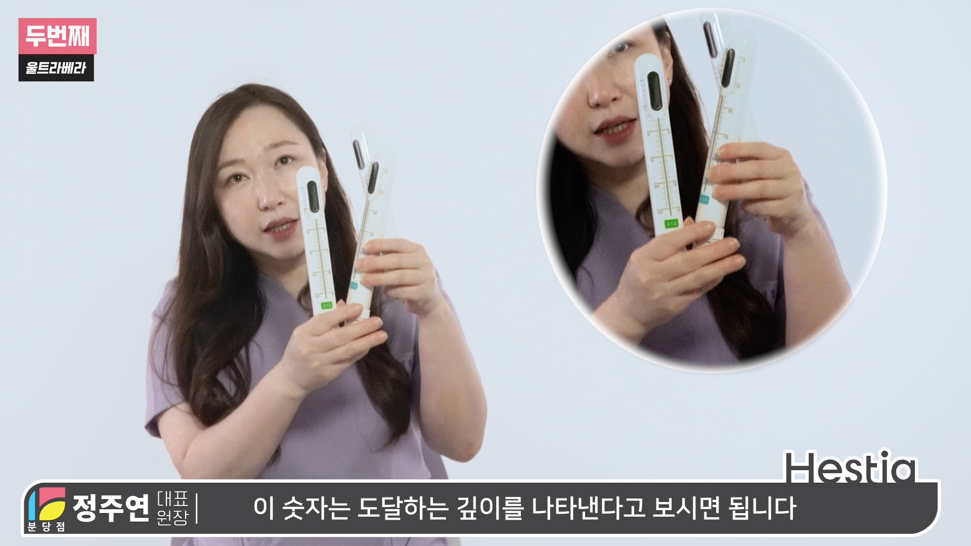 두 번째는 하이푸라고 하는 고강도의 집속초음파를 사용하는 방식에 울트라베라(질세라)에요. 이번에는 질세라에 사용하는 팁을 보여드릴게요. 실제로 질세라에서 사용하는 팁은 이렇게 세 가지 종류의 팁을 사용하고 있어요. 차이점은 여기 아래에 보이는 숫자가 있죠. 이 숫자는 도달하는 깊이를 나타냅니다. 이렇게 생긴 프로브를 질 내부에 삽입을 하게 되고 깊이는 이 숫자를 통해서 보이게 돼요.