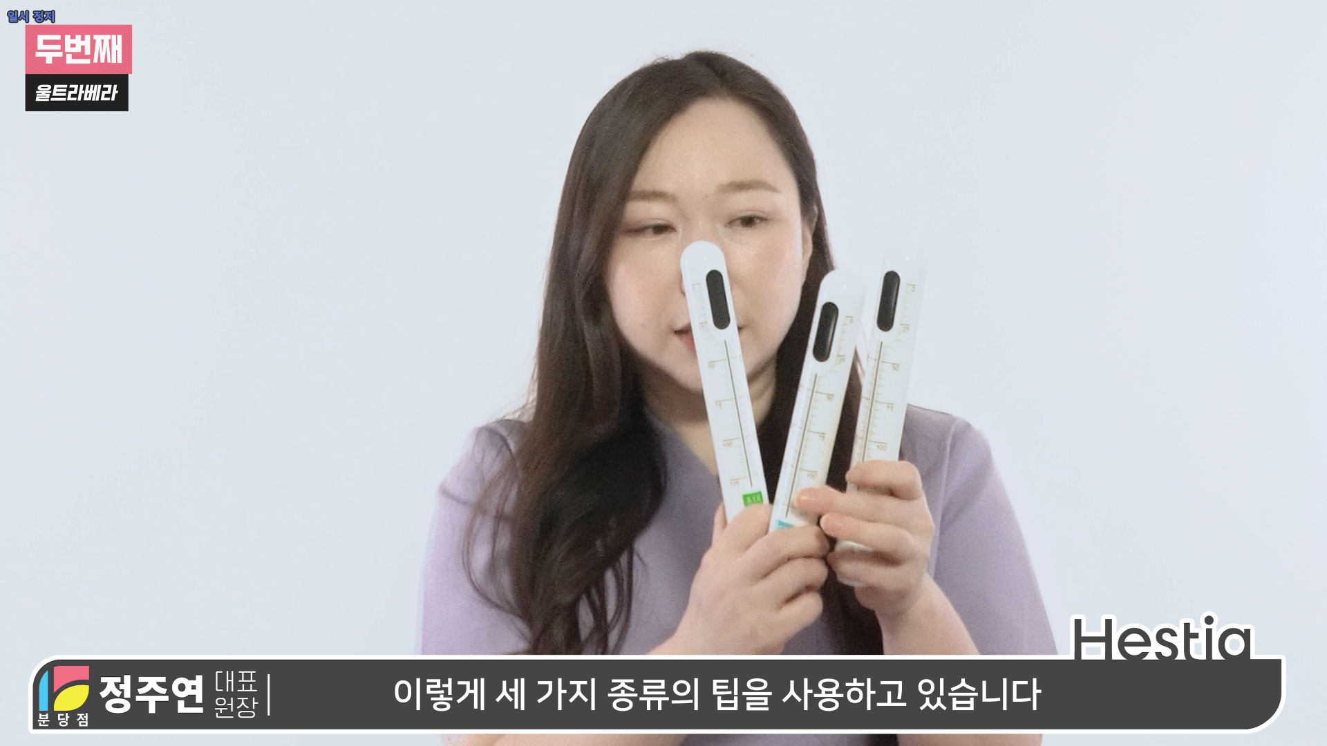 두 번째는 하이푸라고 하는 고강도의 집속초음파를 사용하는 방식에 울트라베라(질세라)에요. 이번에는 질세라에 사용하는 팁을 보여드릴게요. 실제로 질세라에서 사용하는 팁은 이렇게 세 가지 종류의 팁을 사용하고 있어요. 차이점은 여기 아래에 보이는 숫자가 있죠. 이 숫자는 도달하는 깊이를 나타냅니다. 이렇게 생긴 프로브를 질 내부에 삽입을 하게 되고 깊이는 이 숫자를 통해서 보이게 돼요.