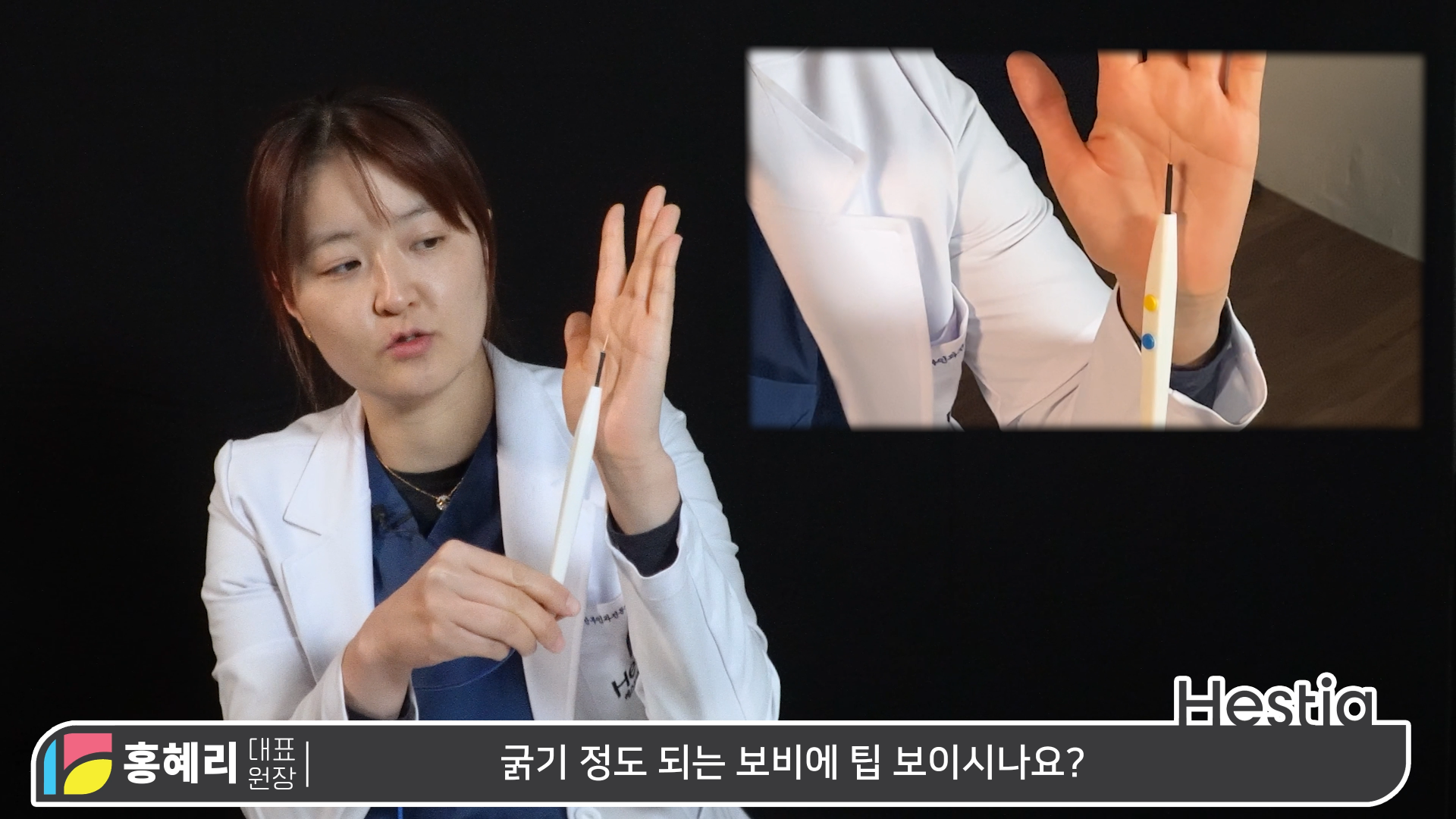 지혈을 할 때는 끝이 뾰족한게 아니고 동글한 팁을 이용해서 지혈을 하기도 해요. 은근히 소음순이나 대음순에 굵은 동맥 혈관들이 꽤 많기 때문에 그리고 특히 소음순에는 지지해 주는 피하지방 조직이 없기 때문에 지혈이 굉장히 중요해요. 그래서 이제 이런 열 에너지를 이용한 기구가 아닌 메스나 가위만을 이용해서 수술하는 데는 야간 무리가 있다고 보시면 됩니다. 그리고 볼팁 같은 경우에는 동그랗게 조직을 태을 수 있기 때문에 환자 분들께서 소음순의 미백을 원하시거나 박피 소음순색을 밝게 만들고 싶다 그런 경우에는 둥근 팁을 이용해서 저희가 미백시술을 하기도 해요. 생각보다 까만 소음순에 스트레스를 받는 환자분들이 많습니다.