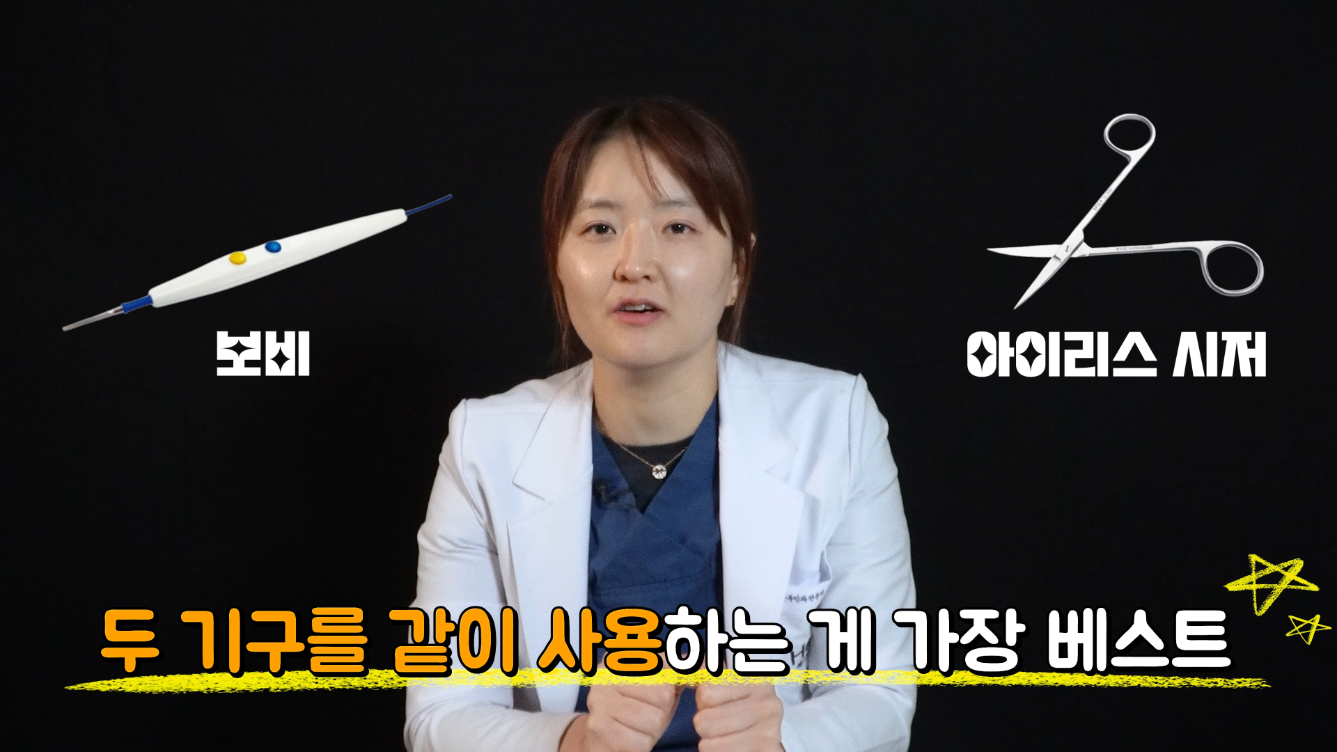 저희가 음핵 주변에 조금 예민한 피부를 절개할 때 그리고 저희도 사람이다 보니까 이렇게 고주파에 굉장히 얇은 팁을 이용해서 선을 쭉 긋더라도 그 부분이 약간은 딱 예쁘게 절개가 안될 때가 있어요. 그럴 때는 아이리스 시저 흔히 여자분들은 속눈썹을 다듬는 가위 집에도 많이 가지고 계시지요? 의료용으로 아이리스 시저가 있어요. 아이리스 시저로 예민할 수 있는 열이 닿아서 조직에 영향을 줄 수 있는 부위는 아이리스 시저로 조직을 살짝 정리를 하곤 해요. 그래서 저 같은 경우는 혈관이 풍부한 소음순 중심부의 큰 조직들은 보비 고주파를 이용해서 절단하고 지혈을 해요. 음핵 주변의 아주 섬세한 조직들 아주 예민한 조직들 같은 경우에는 아이리스 시저를 이용해서 조직을 조금씩 다듬어요.