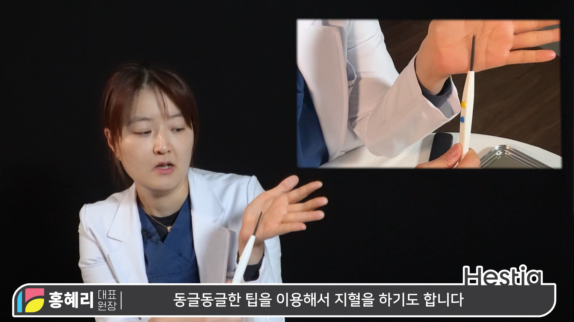 지혈을 할 때는 끝이 뾰족한게 아니고 동글한 팁을 이용해서 지혈을 하기도 해요. 은근히 소음순이나 대음순에 굵은 동맥 혈관들이 꽤 많기 때문에 그리고 특히 소음순에는 지지해 주는 피하지방 조직이 없기 때문에 지혈이 굉장히 중요해요. 그래서 이제 이런 열 에너지를 이용한 기구가 아닌 메스나 가위만을 이용해서 수술하는 데는 야간 무리가 있다고 보시면 됩니다. 그리고 볼팁 같은 경우에는 동그랗게 조직을 태을 수 있기 때문에 환자 분들께서 소음순의 미백을 원하시거나 박피 소음순색을 밝게 만들고 싶다 그런 경우에는 둥근 팁을 이용해서 저희가 미백시술을 하기도 해요. 생각보다 까만 소음순에 스트레스를 받는 환자분들이 많습니다.