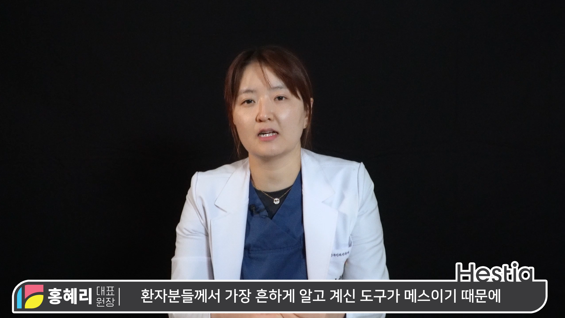 제가 이영상을 찍게 된 이유가 어떤 병원은 메스, 어떤 병원은 레이저 고주파 이런 에너지 기구만 이용한다 이런식으로 광고가 되는 경우가 많이 있던데 각 기구들이 가지는 장단점이 있기 때문에 두 가지를 다 쓰는 게 사실 저는 가장 좋다고 생각해요. 어느 것 하나도 완벽하게 모든 수술을 할 때 조건을 충족시킬 수는 없기 때문에 대부분의 회음부수술을 하는 병원들은 두 가지 도구를 다 사용하고 있고 저희 병원도 마찬가지로 두 가지 도구를 다 사용해서 좀 예민할 수 있는 부분은 에너지로 인한 화상 손상이 거의 없도록 가위를 이용하고 만약에 좀 지혈이 많이 필요한 부분은 고주파를 이용하고 있어요.